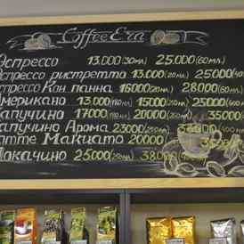 В кофейной карте «КофеЭра» представлены классические кофейные напитки и напитки на основе кофе, как раф-кофе, капуджиро, айс капуджиро. Также здесь есть различные сорта чаячерный, зеленый, белый) и горячий шоколад. Из десертов можно попробовать эклеры, пирожные, шоколад и другие сладости.